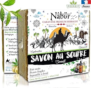 Nabür - Savon Soufre, Glycérine Végétal | Arbre à thé BIO, Olive, Coco, Karité, Laurier | Peau Grasse, Acné, Peau à problèmes, Eczéma, Démangeaisons | Saponifié à Froid