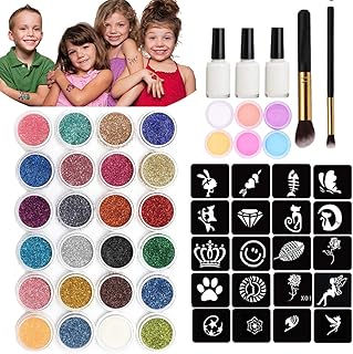 Chnaivy Tatouages Temporaires Tatouage de Paillettes Kit Tatouage Glitter Art corporel pour Filles 24 couleurs de paillettes,118 Pochoirs Cadeau Parfait Pour Carnaval, Halloween, Face Painting