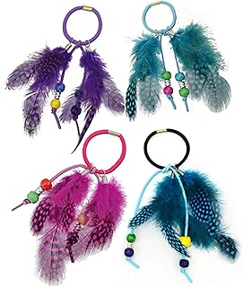 Lot de 4 élastiques à cheveux faits à la main avec plumes et élastiques pour queue de cheval hippie pour fille et femme (couleur aléatoire)